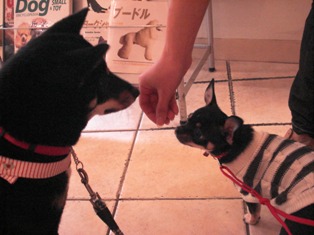 ![]() ネタがないので逃げてたわけではありません・・・でもネタためてきましたよ ![]() まずはももたのおデート また箕面のDOGLIVINGへ![]() ドモ!!! デートのお相手は・・・ ハーイ!リクデス!!! あら、かわいい!!無理矢理ヒザに乗っける陸のオカン ![]() 平日の昼間だったので人も少なくてくつろげる雰囲気むんむん ![]() 他に▽・エ・▽もいないので、ももたへ新たな試練を・・・そうだ!降りてみよう! チーン・・・・ ( ゚∀゚)アハハ八八ノヽノヽノヽノ \/ \/ \!!!!!! ブニョーン・・・ ・゚・(ノ∀`)σ・゚・。いーーひっひっひっひ!!!!!!!! ももたがそんな顔してるから陸ちゃん浮気してるでー。(相手も♀だけど・・・) ワサビデスゥ。モフッ! リクデス!! 尻尾フリフリ、もふもふのかわいいワサビちゃん登場! ももたにも一応興味を示してくれてたけど、ももたの死んだような態度に 愛想をつかしてた模様・・・ ![]() でも陸ちゃんとは2回目だったせいかこんな雰囲気で見事進歩をとげていた ![]() 前回はこんな感じ・・・ モッテルノ? モッテルンカ? 差し出される持ってそうな手に誘われて~ ![]() オヤツパワーはどんなことにも打ち勝つのねーーーー ![]() すごいね!!!おやつ!!!!! でもな、持ってないで・・・陸ちゃんとももたの嗅覚に疑問を感じたカフェ編でした ![]() 鼻つまってんのか? ぽちっと応援お願いします